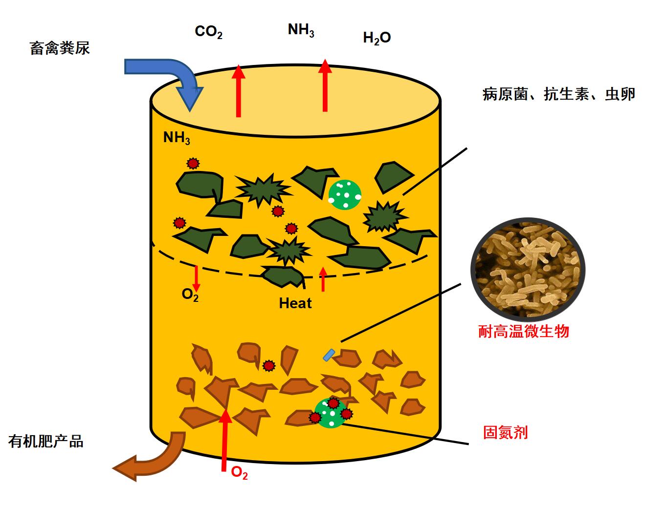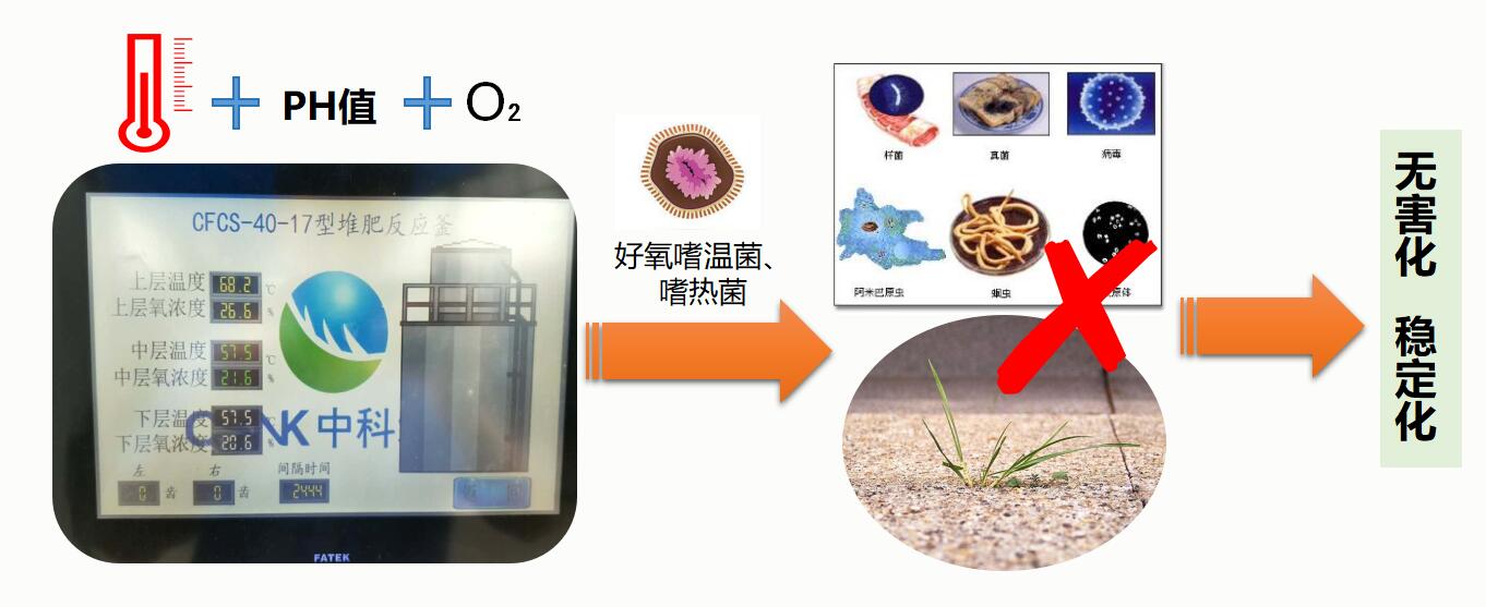 好氧堆肥發酵過程是一個微生物學處理過程,在一定溫度和PH值下,供氧通風,利用好氧嗜溫菌和嗜熱菌對其中有機物進行生化分解,降解成穩定腐殖質。同時,利用發酵過程中產生的溫度(一般達55-60℃,最高溫度可達70℃)殺死病原微生物、寄生蟲和雜草種子,以達到無害化處理指標。